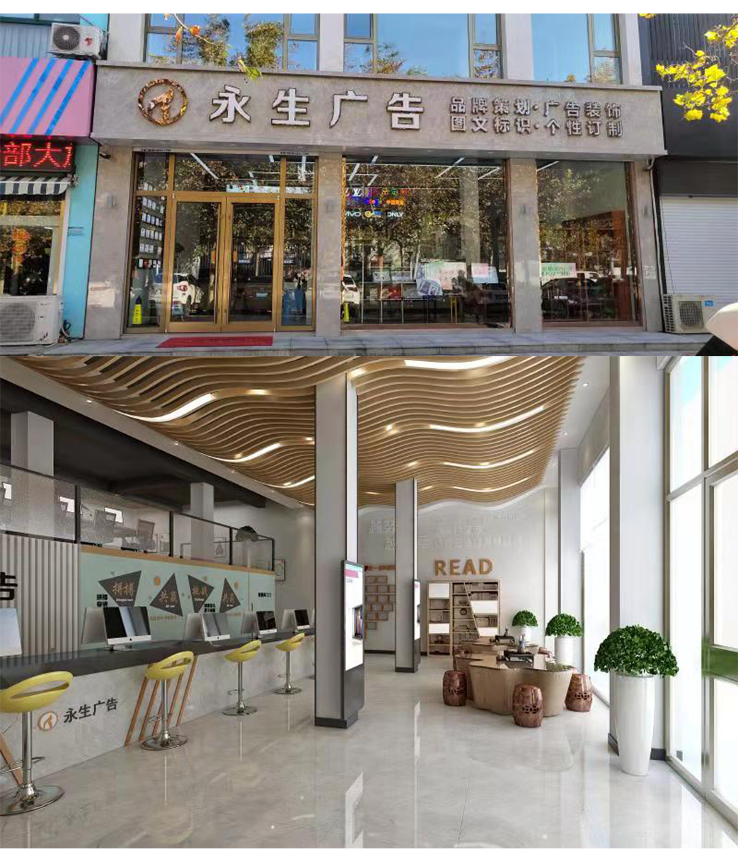 公司自有數碼沖床設備、500W光纖機、高精度大幅面噴繪機、寫真機、UV機、多種大小型雕刻機、吸塑機、全自動圍字機、自動開槽機、激光焊接機、拋光機等生產加工設備,擁有完善的設計團隊、技術團隊、施工團隊、售后團隊,可為廣大客戶提供室內裝修、店招門頭、精神堡壘、黨建標識、標識標牌、宣傳欄、LED顯示屏、警示標識、精品字、證卡胸牌、證書獎杯、燈箱、桌牌、定制禮品、展具、噴印等多種專業廣告服務...